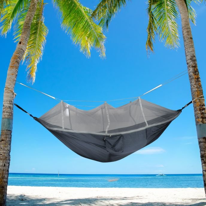 Seamless Outdoor Sleeping Hammock With Mosquito NetHammock Material: 210D nylon fabric (Parachute cloth)Mesh Material: High-Density NetSpecifications:  102in × 55.18inNet Weight: (1.43lb)Maximum Support Weight: 660lbs (300kg)Accessories:2m strap × 24m draw rope × 2Color Options: 14 colors availableApplicable Scenarios: Picnics, outings, camping, etc.Features:High-Quality Mesh Protection: High-density mesh prevents mosquitoes from entering, ensuring a comfortable and breathable outdoor experience.Easy Setup: Simple strap and rope installation allows for quick setup between trees.Lightweight & Portable: Weighing only 650g (1.4lb), it’s easy to carry for camping, hiking, and beach trips without adding bulk.Adjustable Strap System: Standard 2m strap allows for flexible tree distance adjustments, enhancing convenience.User-Friendly Installation: Mosquito net design enables hassle-free setup—just wrap the straps around trees, tighten, and enjoy.