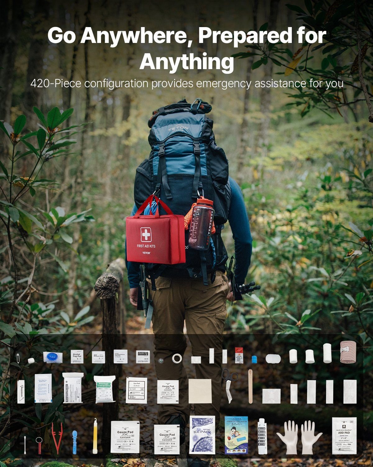 1.420-Piece Professional Survival Kit: Packed with various medical supplies and tools, including elastic bandages, gauze, alcohol pads, and emergency blankets. This first aid kit covers all your common injury and accident needs